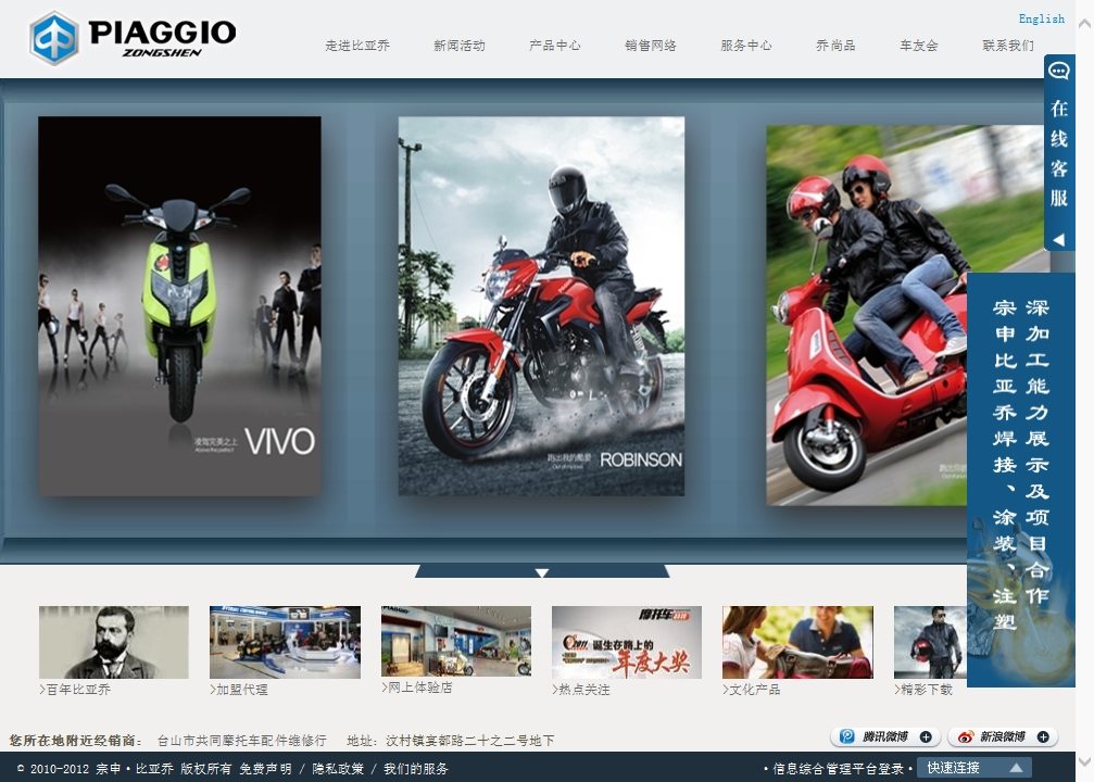 宗申·比亚乔佛山摩托车企业有限公司是由意大利比亚乔集团与中国宗申产业集团于2004年4月合资重组成立的集研发、生产、营销于一体的高科技摩托车企业,首期工程融资额2亿元人民币,注册资本2980万美元。公司位于多宝(中国)省佛山市张槎高新技术开发区,占地面积11万平方米。